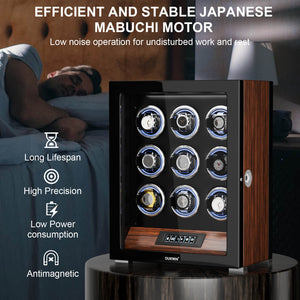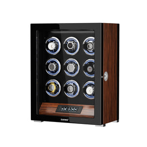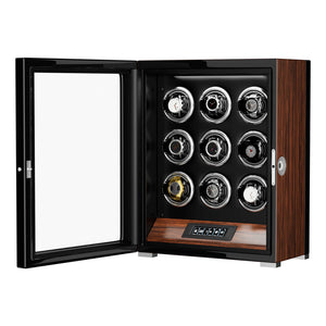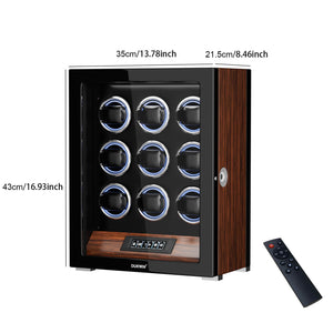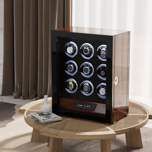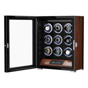 9 Watch Winders with Fingerprint Unlock RGB Light LCD Remote Control Ultra Quiet Motor - Walnut