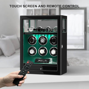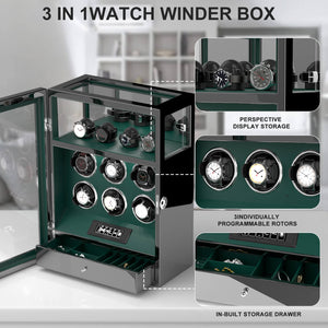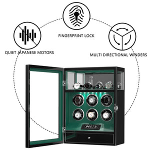 Fingerprint Lock 6 Watch Winders with Extra Watches Storage LCD Remote Control - Green