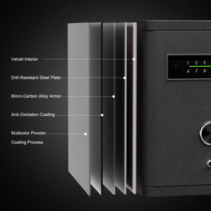 Weighing 45 kg (100.31 lbs) net and 57 kg (125.66 lbs) with packaging, this safe combines substantial weight with uncompromising construction for enhanced security. Crafted with a full-steel frame, solid door panel, precision steel locking bolts, and an anti-oxidation coating, it is further reinforced with a keypad combination lock and fire-resistant sealed door - providing exceptional protection against burglary. Please note: this safe is designed for standalone use and cannot be wall-mounted or in-wall installed.