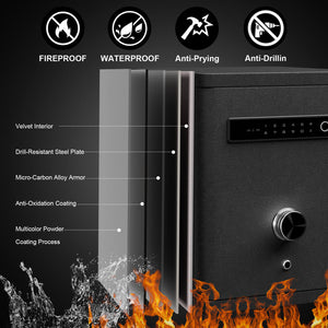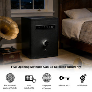 Weighing 45 kg (100.31 lbs) net and 57 kg (125.66 lbs) with packaging, this safe combines substantial weight with uncompromising construction for enhanced security. Crafted with a full-steel frame, solid door panel, precision steel locking bolts, and an anti-oxidation coating, it is further reinforced with a keypad combination lock and fire-resistant sealed door - providing exceptional protection against burglary. Please note: this safe is designed for standalone use and cannot be wall-mounted or in-wall installed.