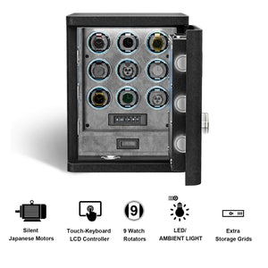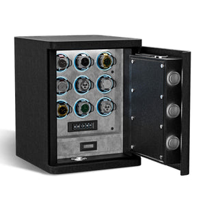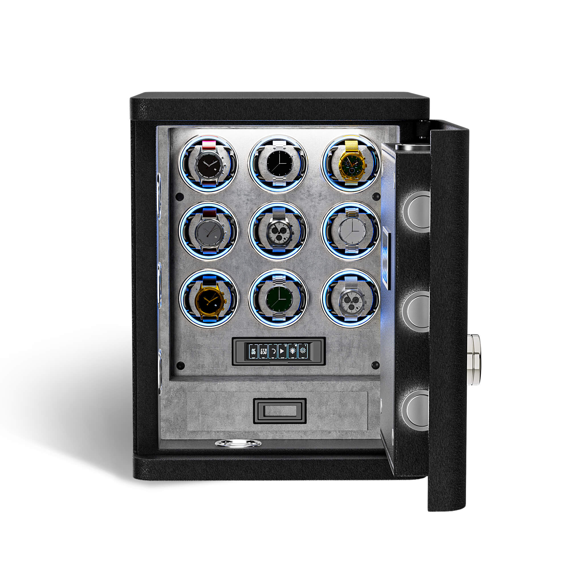 The Obsidian Veil Series watch winder safe is a multifunctional lockable 9-unit watch winding system with additional storage, designed to securely and reliably wind your timepiece collection.