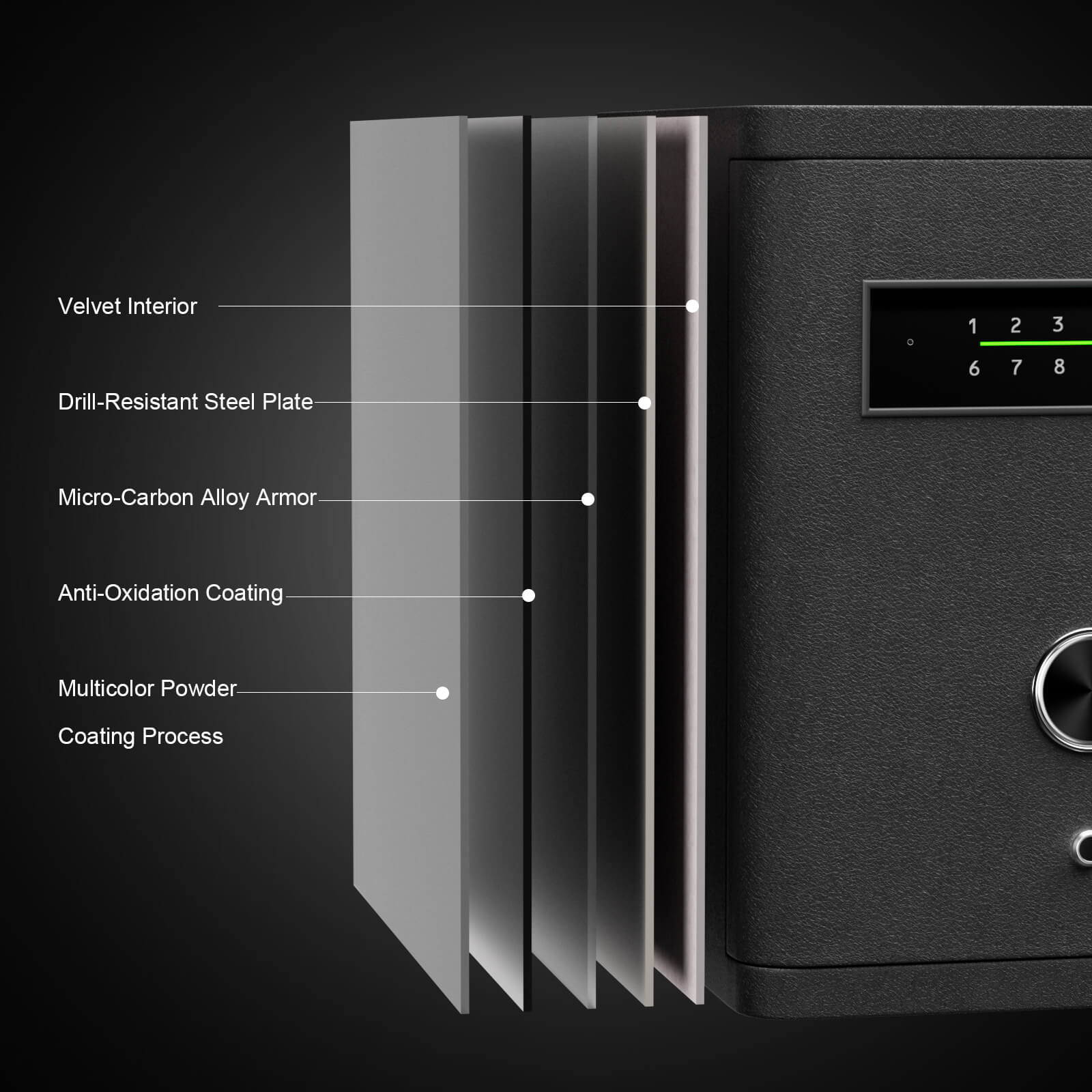 Material | - Drill-resistant steel plate - Micro-carbon alloy armor - Anti-oxidation coating - Velvet lining interior |