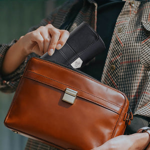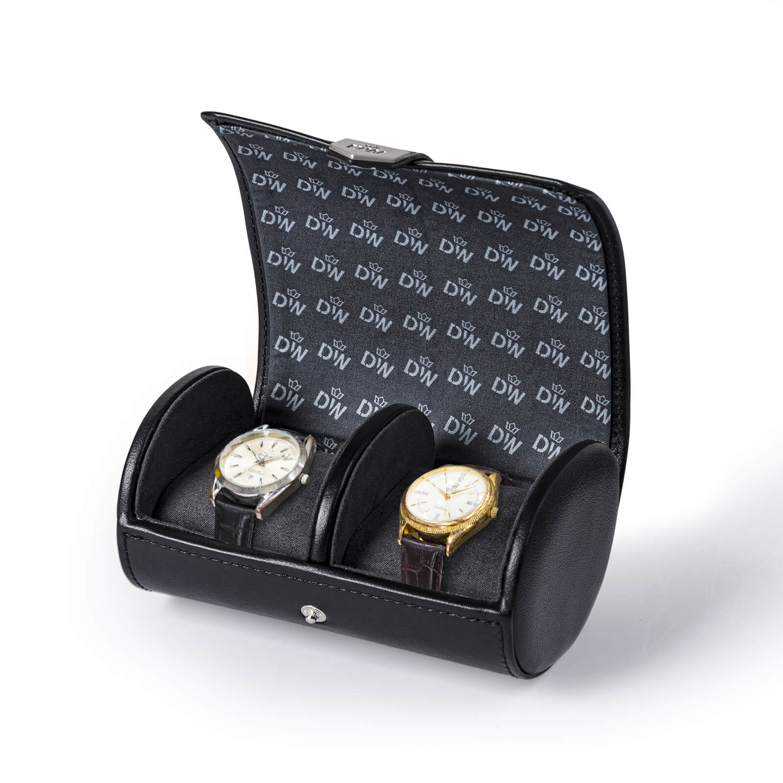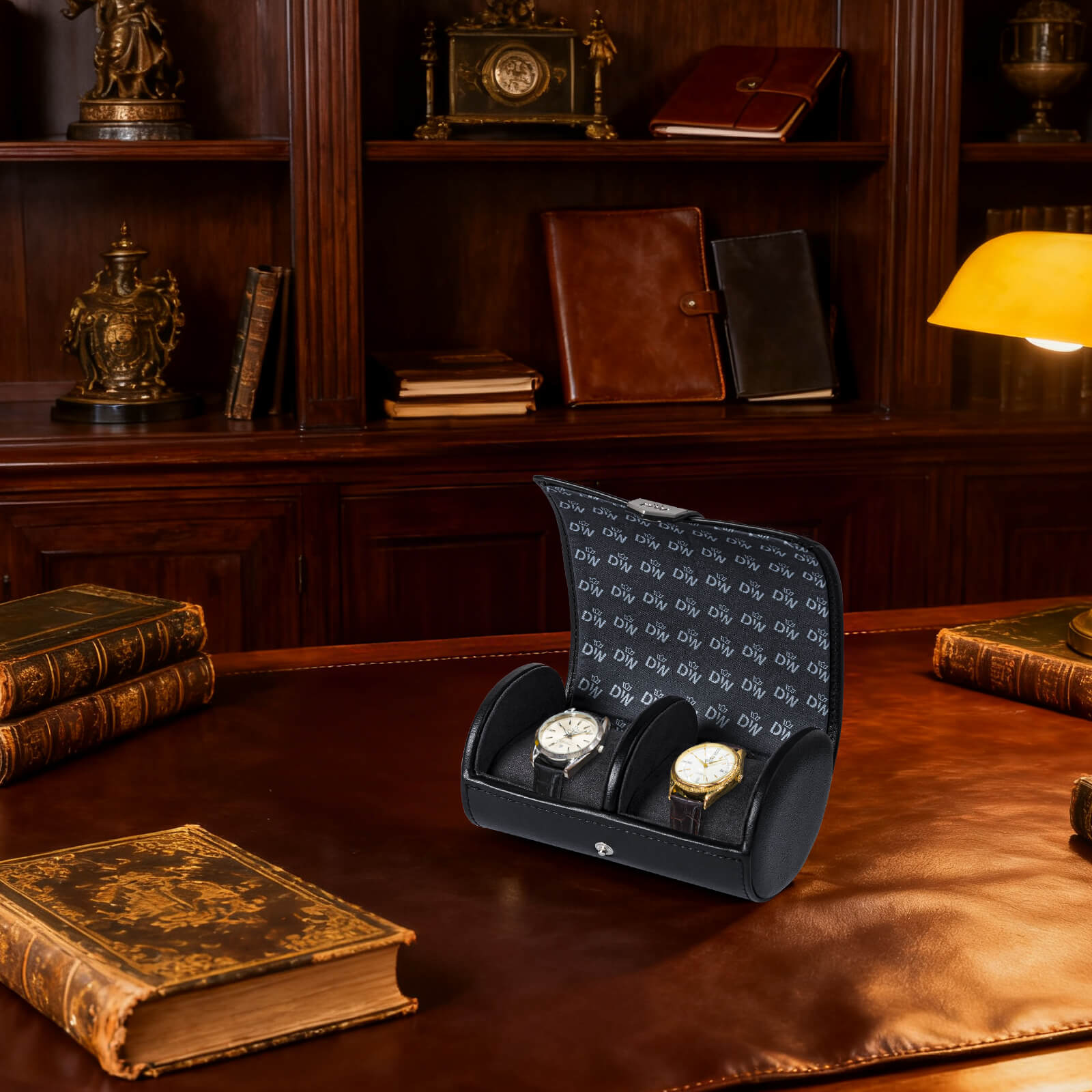 Double Watch Roll is crafted with eco-friendly vegan leather, finished with our signature DUKWIN logo metallic closure. The interior is lined with DUKWIN’s iconic patterned fabric, while the two watch cushions are wrapped in soft faux suede. Designed exclusively to hold two timepieces, this compact roll is perfect for secure travel and everyday storage.