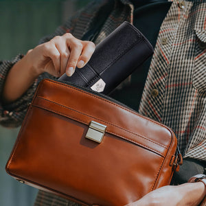 Triple Watch Roll is crafted with eco-friendly vegan leather, finished with our signature DUKWIN logo metallic closure. The interior is lined with DUKWIN’s iconic patterned fabric, while the watch cushions are wrapped in faux suede. Designed to hold up to three watches, it also features a hidden compartment—perfect for storing cufflinks, rings, or other small accessories.