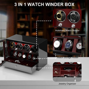 4 remontoirs de montres pour montres automatiques avec organisateur d'affichage de 6 montres - Rouge
