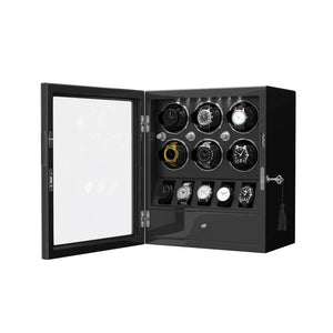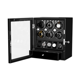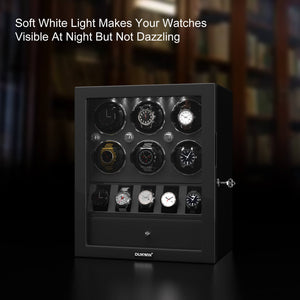 Matériau : Le remontoir automatique DUKWIN pour 6 montres est fabriqué en bois fait à la main avec une fenêtre en verre organique acrylique, un extérieur élégant en piano brillant et un intérieur en cuir végétalien.