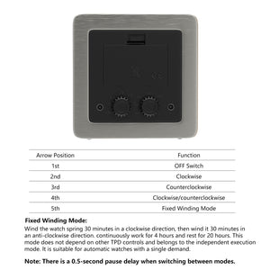Réglages de rotation multiples : Le remontoir Dukwin offre trois sens de remontage (horaire, antihoraire ou bidirectionnel) et cinq réglages de rotation par jour (650, 750, 850, 1 000 ou 1 950 tours par jour), adaptés à la plupart des montres mécaniques du marché. (Remarque : démarrez le remontoir pendant quelques minutes, puis arrêtez-le. Patientez ; le remontoir se mettra automatiquement en marche dans l'heure qui suit, selon un cycle horaire.)