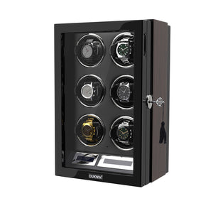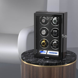Cet élégant remontoir Dukwin pour 6 montres est la solution idéale pour remonter jusqu'à 6 montres simultanément. Présenté dans un élégant coffret de présentation fermé, il reflète notre engagement constant pour une conception et une ingénierie de qualité. Il intègre de nombreuses fonctionnalités luxueuses qui le distinguent des autres.
